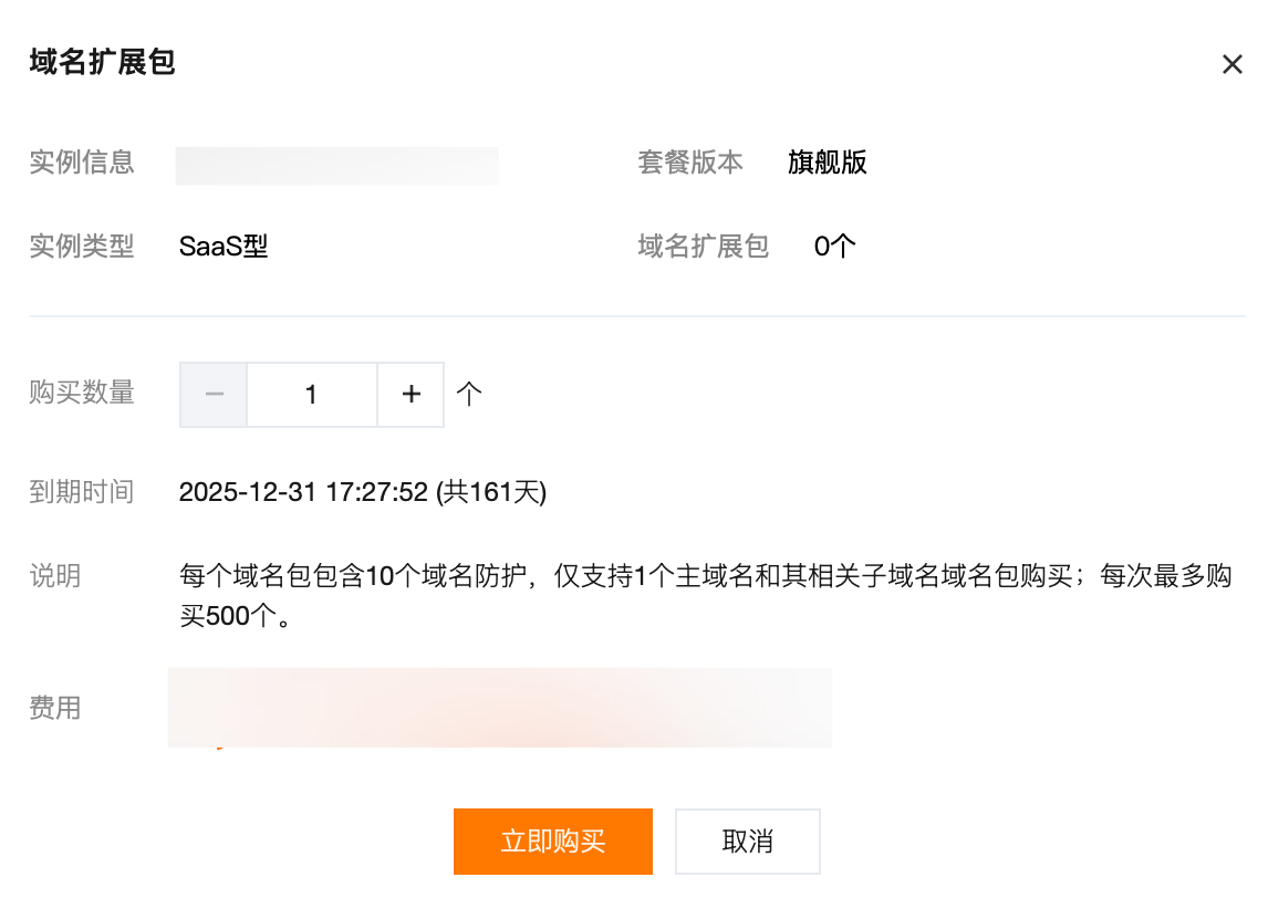 购买域名扩展包:选择购买数量(1-500个),单击立即购买,即可购买域名扩展包。