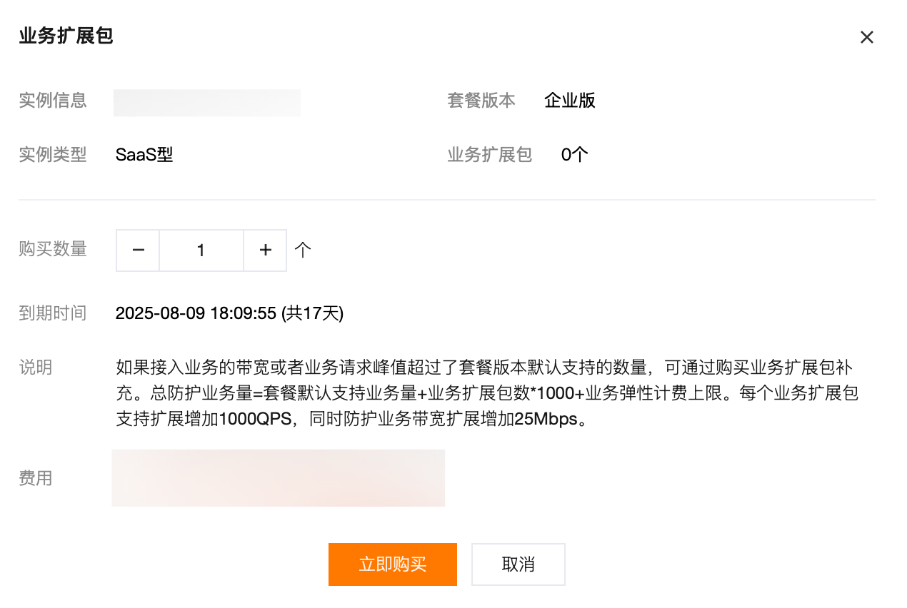 购买业务扩展包:选择购买数量(1-500个),单击立即购买,即可购买业务扩展包。