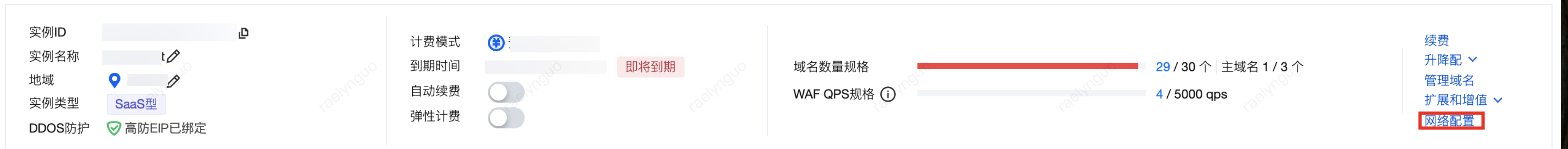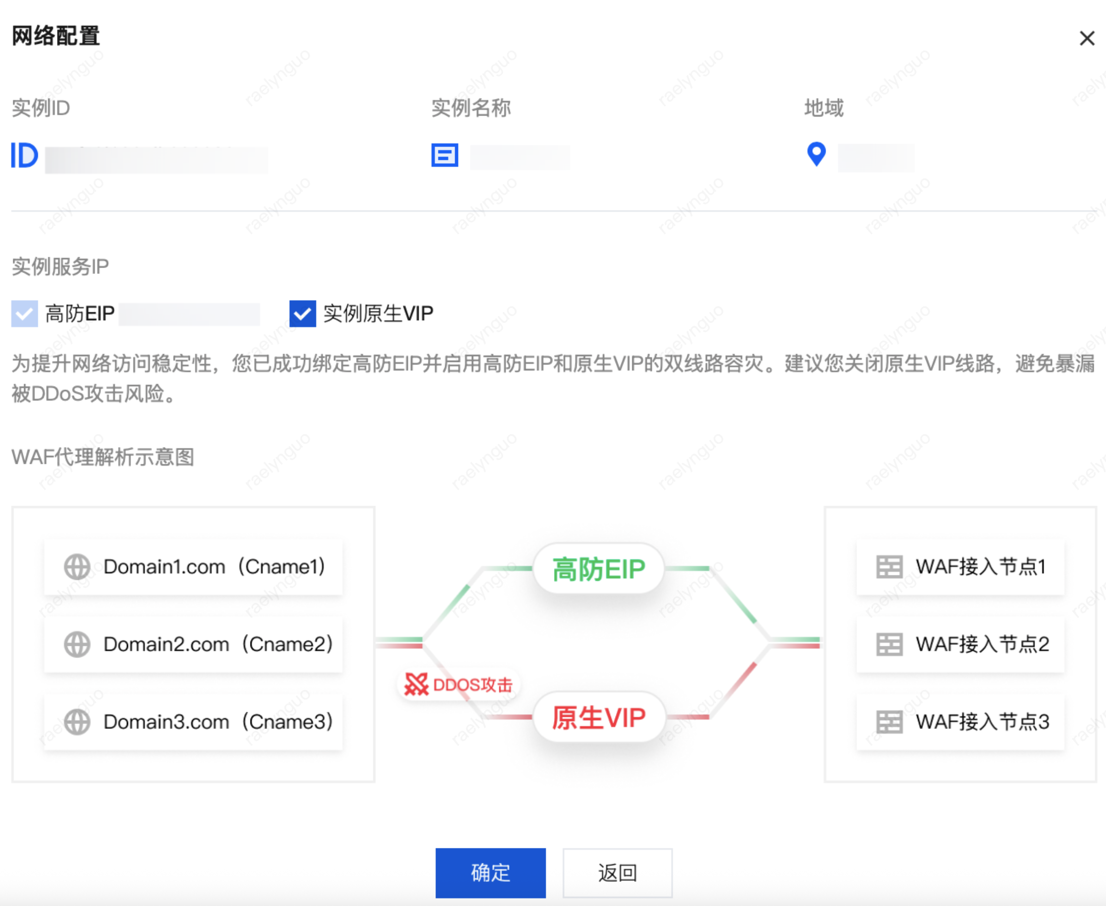 6. 在 实例管理页面,对于绑定了高防 EIP 的实例,可进行网络配置。 7. 单击网络配置,弹出网络配置弹窗,WAF 默认启用高防 EIP 和原生 VIP 的双线路容灾,您可在此处关闭原生 VIP 线路,避免暴露被 DDoS 攻击风险。