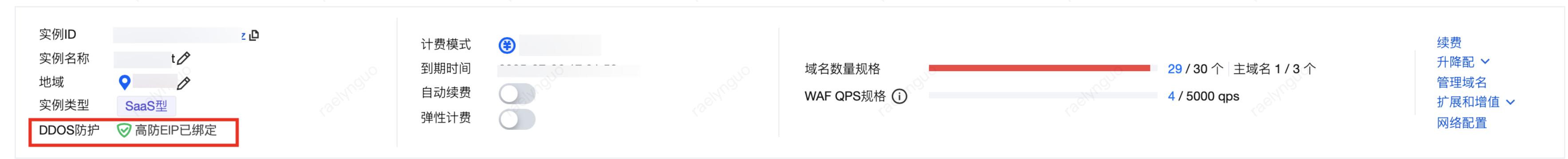 5. 在 EIP 控制台完成 WAF 实例绑定后,您可在 WAF 控制台 实例管理 查看相关信息: 若实例绑定了高防 EIP,在实例类型下方会显示 DDoS 防护状态为高防 EIP 已绑定。