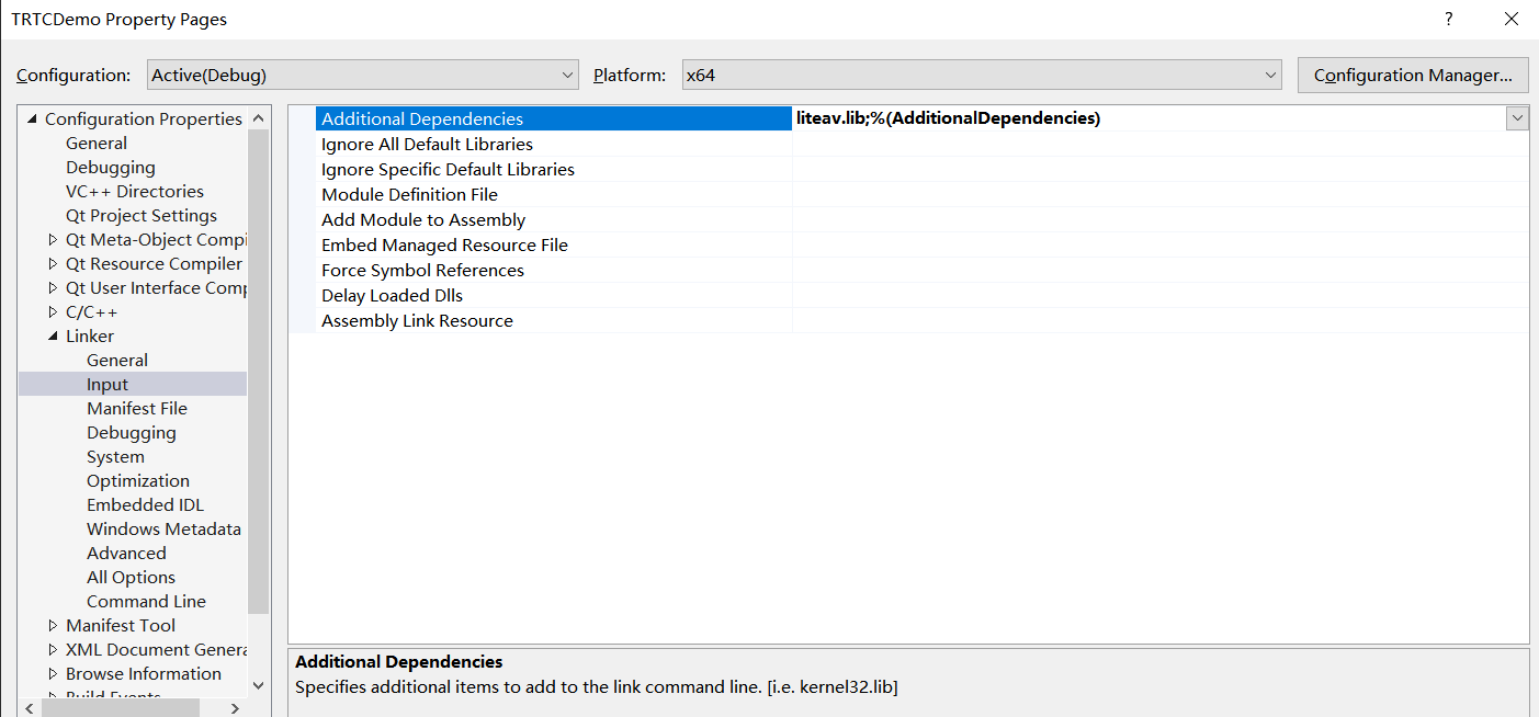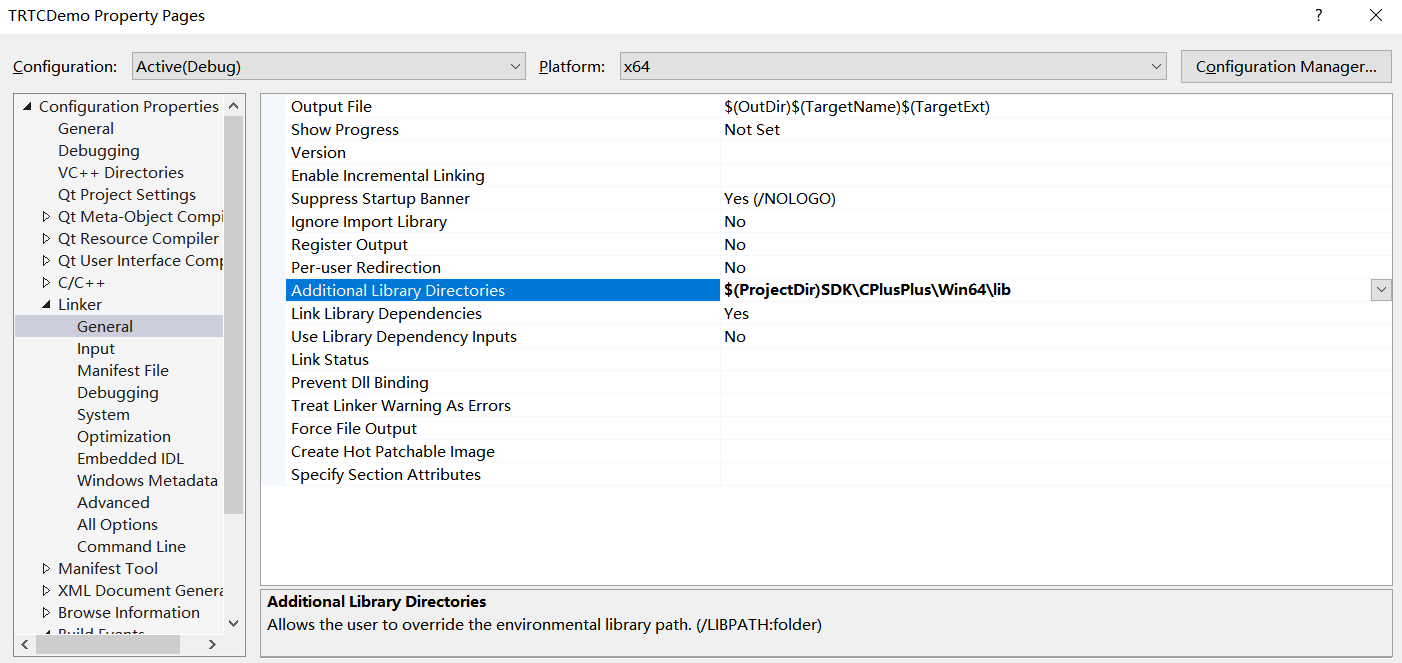 $(ProjectDir)SDK\\CPlusPlus\\Win64\\include 和 $(ProjectDir)SDK\\CPlusPlus\\Win64\\include\\TRTC,如下图所示:$(ProjectDir)SDK\\CPlusPlus\\Win32\\include 和 $(ProjectDir)SDK\\CPlusPlus\\Win32\\include\\TRTC。