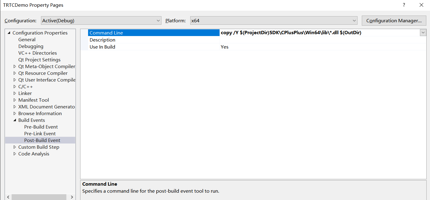copy /Y $(ProjectDir)SDK\\CPlusPlus\\Win64\\lib\\*.dll $(OutDir),能够在编译完成后,自动将 SDK 的 .dll 文件拷贝到程序的运行目录下,如下图所示:copy /Y $(ProjectDir)SDK\\CPlusPlus\\Win32\\lib\\*.dll $(OutDir) 。