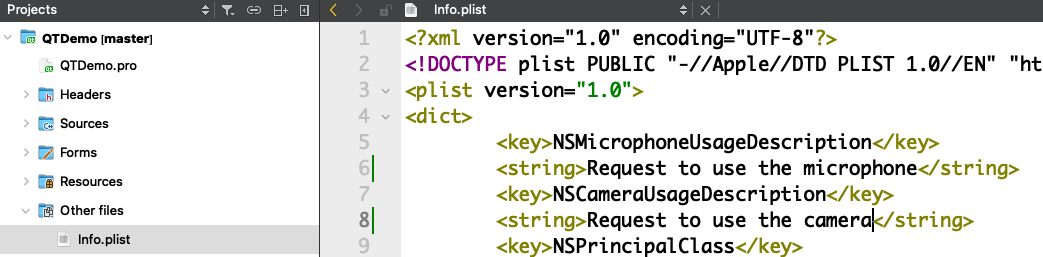 Info.plist 添加对应的权限申请说明:NSMicrophoneUsageDescription : 申请使用麦克风NSCameraUsageDescription : 申请使用摄像头